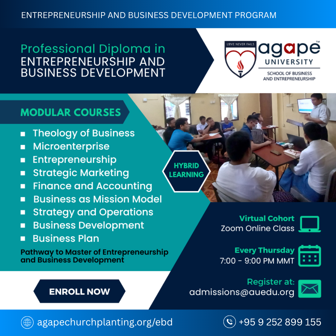 Agape University School of Business and Entrepreneurship provides Christ-centered, high-quality business and entrepreneurship education for leaders called to business as mission and marketplace ministry in the corporate world.