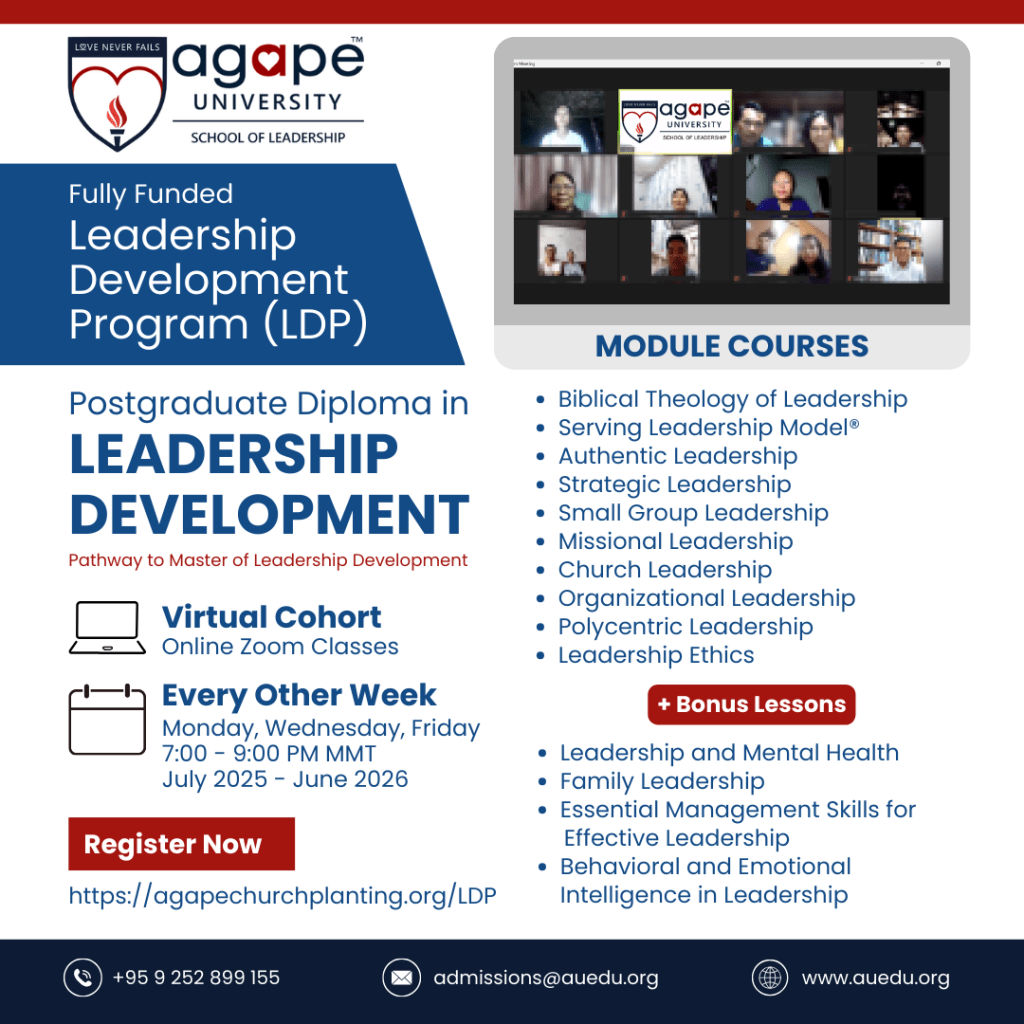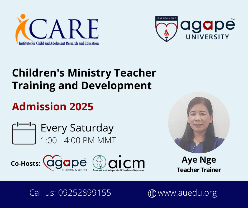 Agape University is the training and development initiative of Agape Vision Global. It is a private institution of Christian higher education in Yangon, Myanmar, administered by Agape Vision Global.