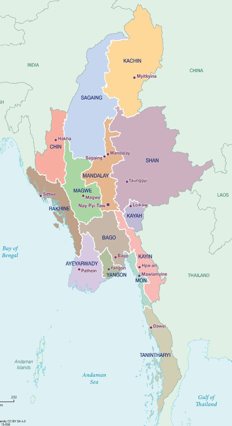 Myanmar (formerly Burma) is a country in Southeast Asia, bordered on the west by India and Bangladesh, on the north and northeast by China, and on the east and southeast by Laos and Thailand.
