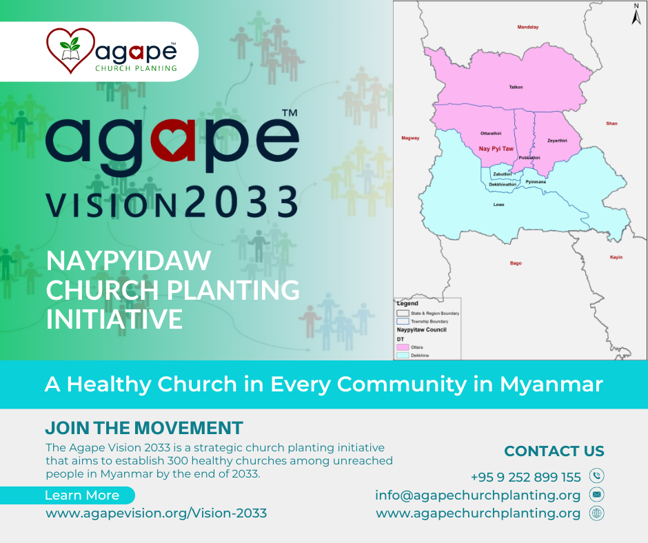Join the Agape Vision 2033, a strategic church planting initiative that accelerates the fulfillment of the Great Commission in our generation by establishing 300 healthy churches among unreached people in Myanmar by the end of 2033.